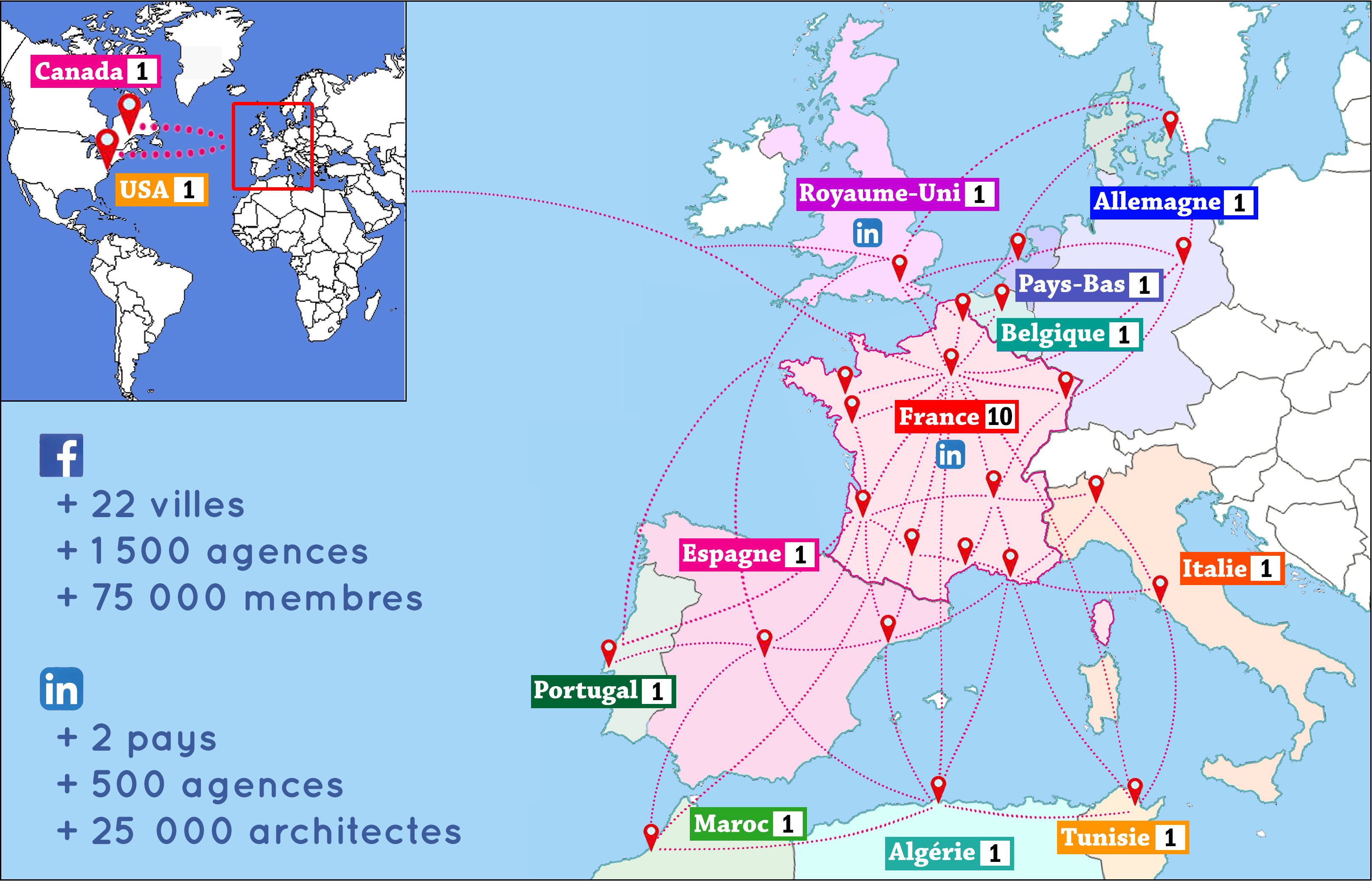 Nous partageons également les annonces et offres d'emploi vers +15.000 architectes référencés sur LinkedIn à travers les 2 pays suivants.